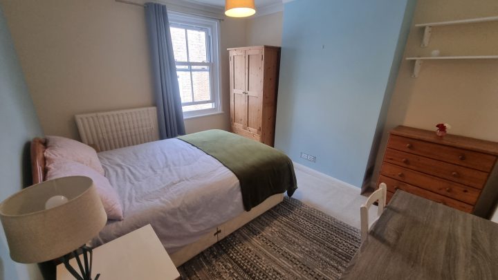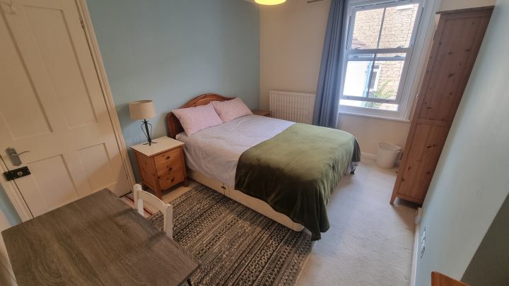 The room is a comfortable and light double room, upstairs at the back of the house. This is the quietest room in the house, with excellent privacy (the building at the end of the garden is an office with obscured windows). The room is fully furnished, and I’m happy to discuss your individual requirements.