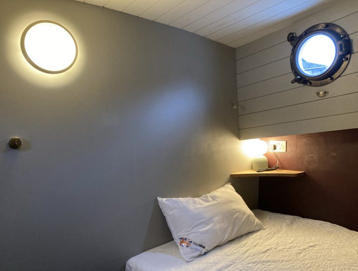 This listing is for a cabin with a built-in bed (somewhere between single and double size) in a 2006 Dutch barge on a permanent mooring in Limehouse Marina. There is a private bathroom with a roll-top bath and a shower over, but it’s not ensuite.