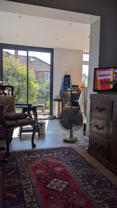 We have the usual things – dishwasher, washing machine, fridge freezer, all new appliances in the kitchen. The kitchen / dining room / snug is large with a breakfast bar, extending table and sofa / TV area. There is a separate living room too.