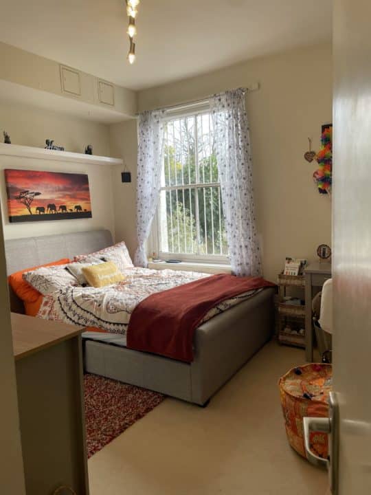 A good size double bedroom – comfortably fits double bed, desk and wardrobe and chest of drawers.