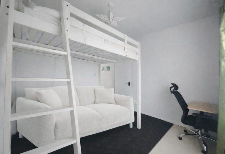 Furnished with a loft bed with storage and a cosy sofa underneath.